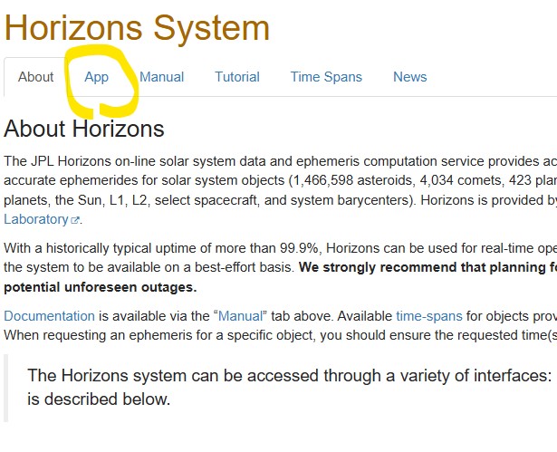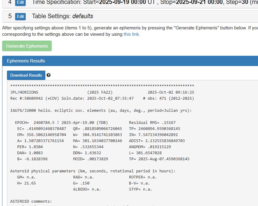 それでは試しに、Horizons Systemを使って任意の期間における小惑星 2025 FA22 の位置データを抽出することにしましょう。