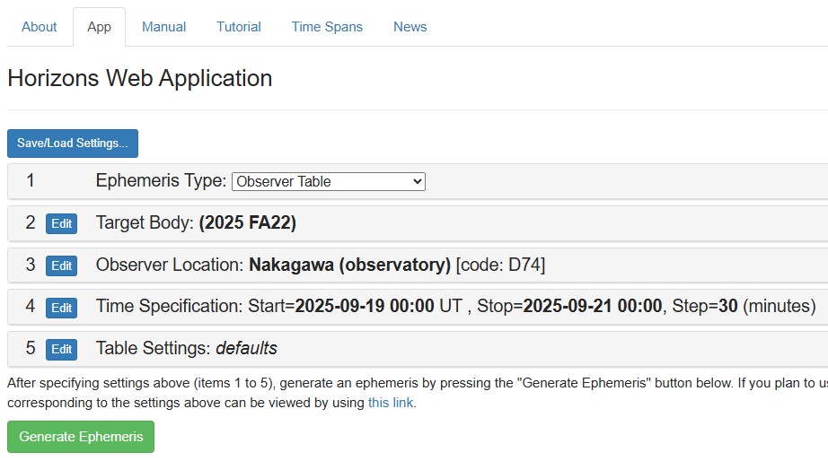 - Edit 2番: 天体名。ここでは小惑星の符号 2025 FA22 と入力(もちろん彗星も扱える)。