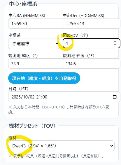 となるので、これを観測星図ツク朗にまず入力しましょう。次に観測地の緯度経度は、Horizons Systemとおよそ同じ値にしておくと良いでしょう。さらに、日時については、UTではなくて日本時間を使い、2025年9月20日01:00 JSTとします。この状態で、星図の描画ボタンを押して、任意の位置の星図が描かれるか確認しても良いです。