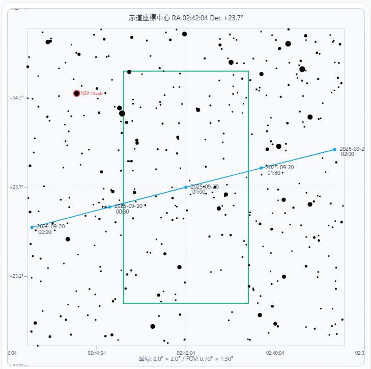 これは最近実施された小惑星 2025 FA22 の観測キャンペーンに関連した星図となります (キャンペーンの詳細はシン・APAONのHPをご覧ください)。地球に接近する NEO と呼ばれるような小惑星を観測する場合、天体の移動が速いため事前に観測する位置や視野を確かめておくことが重要です。そこで、精密な位置計算をしてくれることで有名なNASA JPLのHorizons Systemの計算結果を用い、それをコピペすることで上図を描く機能を本アプリには持たせてあります。
