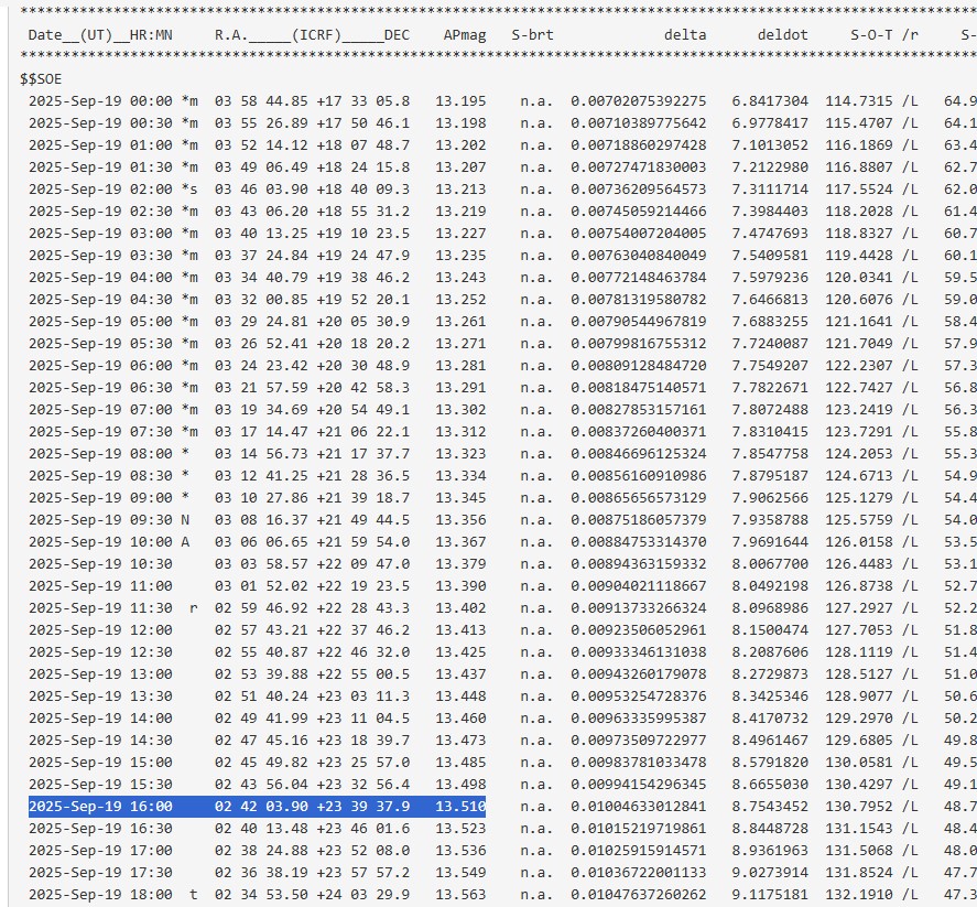 まず冒頭に出てくる数字の羅列はこの天体の軌道要素になります(詳しくは割愛)。そして、さらに下側を見ていくと、数字が表になって並んでいる欄が出てきます。簡単に言えば、これがある任意の観測地における天体の位置 (RA, Dec) や等級などを表しています。
