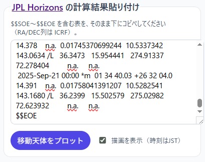 あとは、星図アプリの計算結果貼り付け欄に、ペーストします。そして移動天体をプロットというボタンを押すと、先にお見せしたように、観測星図内に移動天体の位置を描くことができます。このとき、プロットされた日時については、日本時間(JST)に変換されているため、ご注意ください。