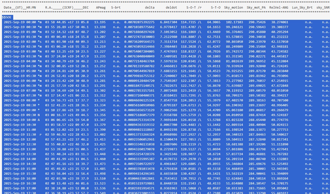続いて星図内に小惑星をするために、Horizons Systemの計算結果をコピーします。このとき $$SOE〜$$EOE に囲われた範囲をコピーしてください。