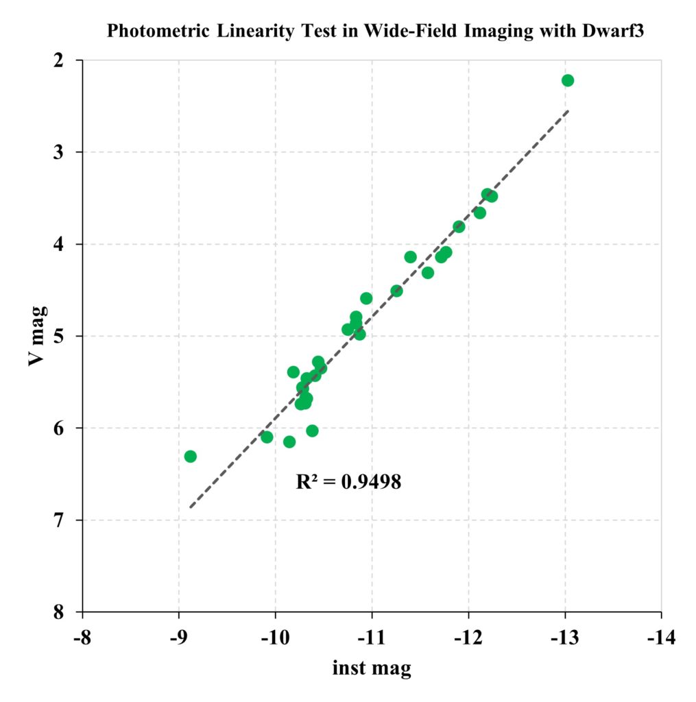 広角ゆえにフラット撮像も重要な要素になるのは当然だが、Dwarf3 はダーク撮像用の遮蔽板が内臓されていないので、これを温度環境に応じて自分で用意する手間があることは、本機のユーザーならよく知っていると思う。もちろん、測光に用いるときもダークは重要なので、Dwarf3 で測光を行うさいは (望遠も広角も) 、1次処理に関する知識を持ったうえで、望む必要がある。